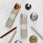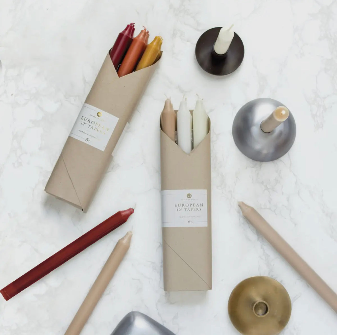 Enjoy an artful combination of taper candle gift sets. Each set includes two candles of three joyful tones, totaling 6 taper candles. These tapers are special, they are smokeless and dripless in a draft-free environment, fragrance-free, and fit standard taper holders. They come in elegant wrapping, perfect for gifting or keeping for yourself!