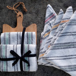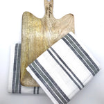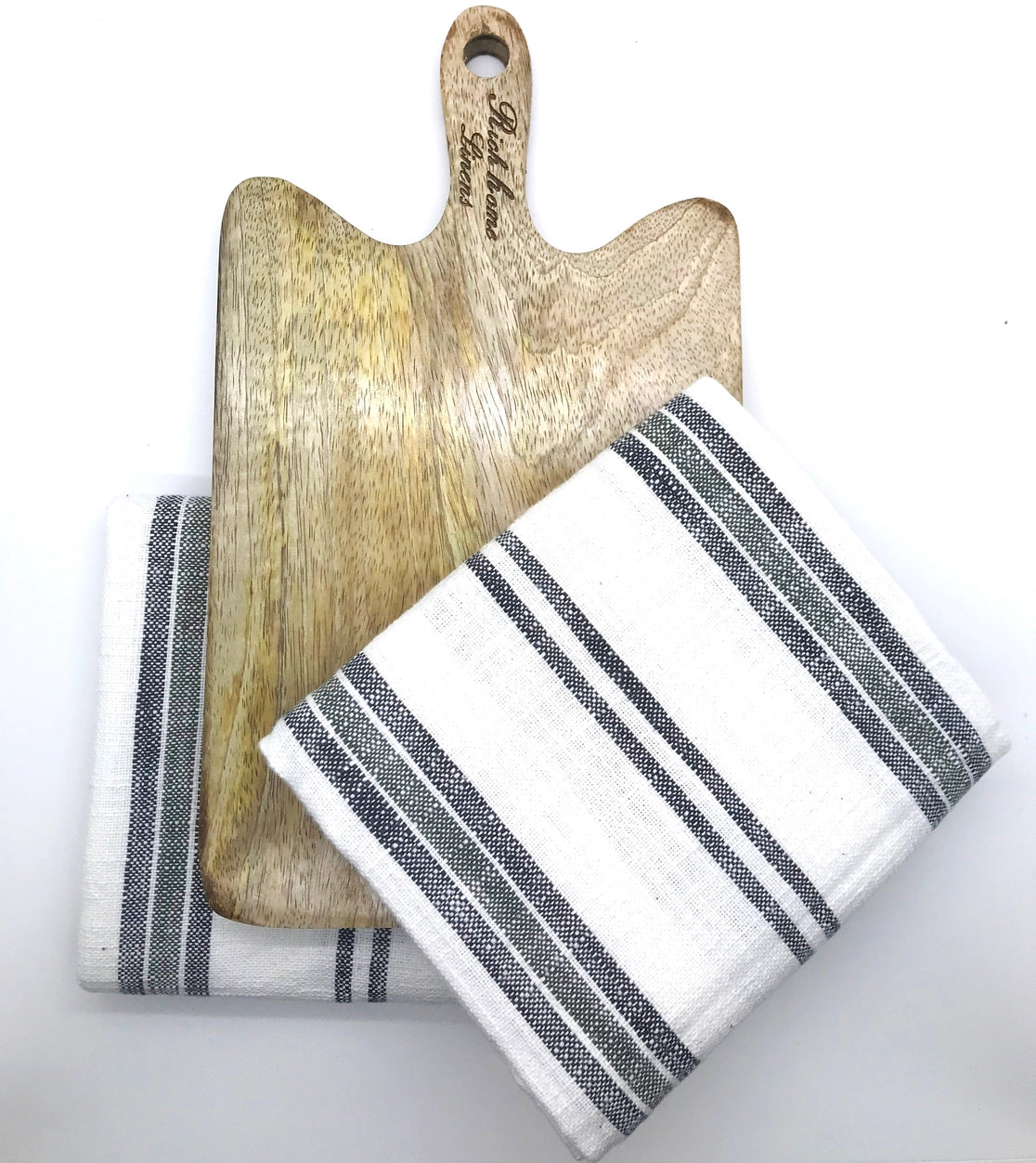 This Tea Towel & Wooden Board Gift Set includes two 100% cotton striped tea towels with a dark olive green accent, and a 12" x 8" acacia wooden board for chopping produce or displaying appetizers.