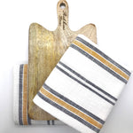 This Tea Towel & Wooden Board Gift Set includes two 100% cotton striped tea towels with a bright orange accent, and a 12" x 8" acacia wooden board for chopping produce or displaying appetizers.