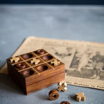 Travel-size sustainably harvested Indian Rosewood Tic-Tac-Toe game. Set of X's and O's to be arranged in the Tic-Tac-Toe circle settings. Stores the small pieces inside the box when not playing.