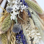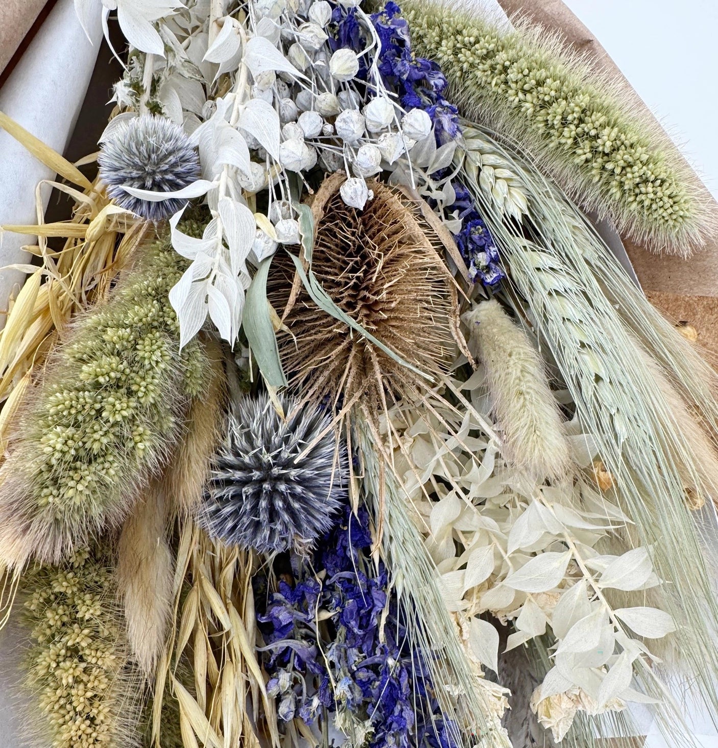 A charming arrangement of Avena, Wheat, Ruskus, Setaria, Larkspur, and Blue Echinops.