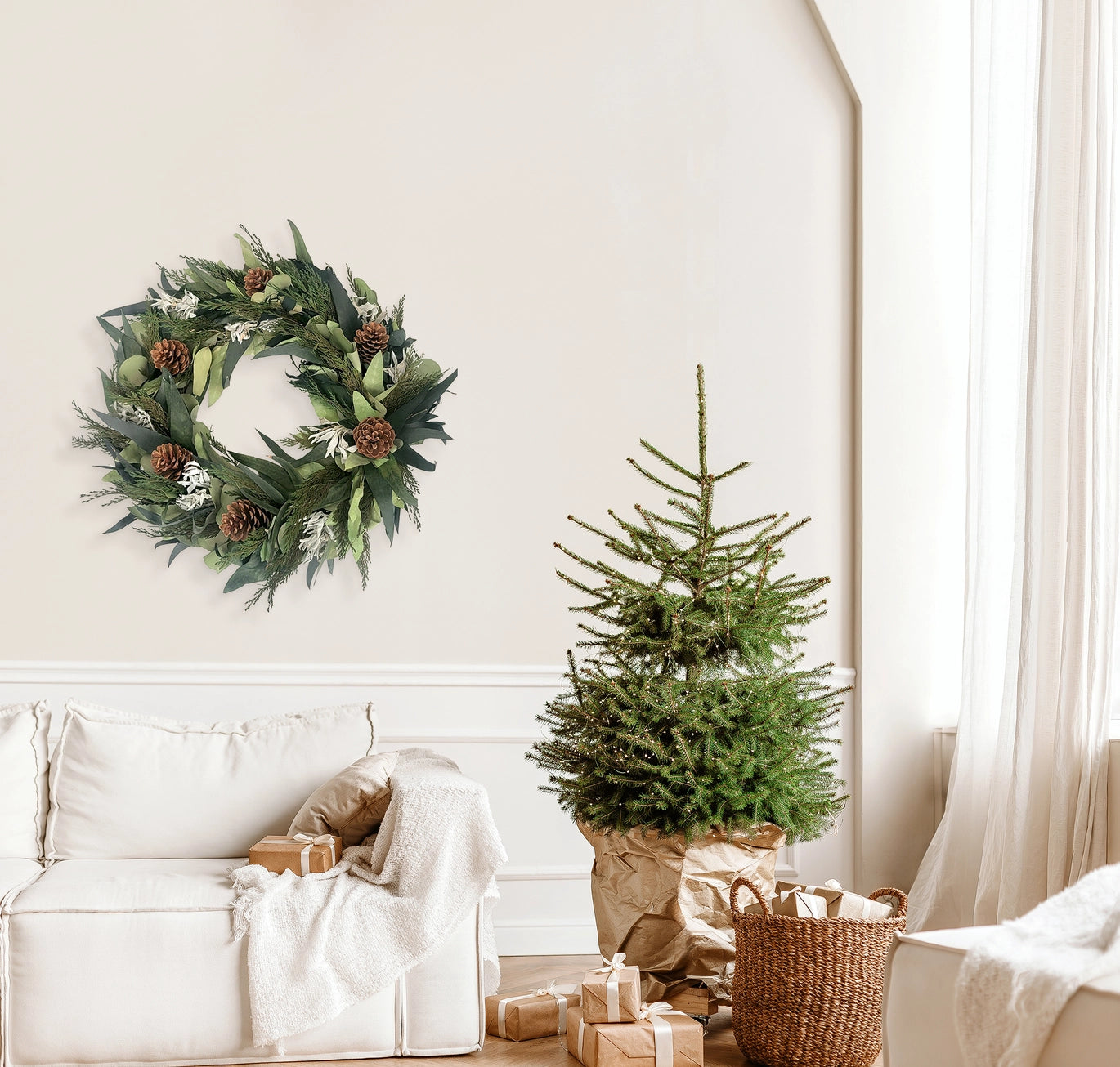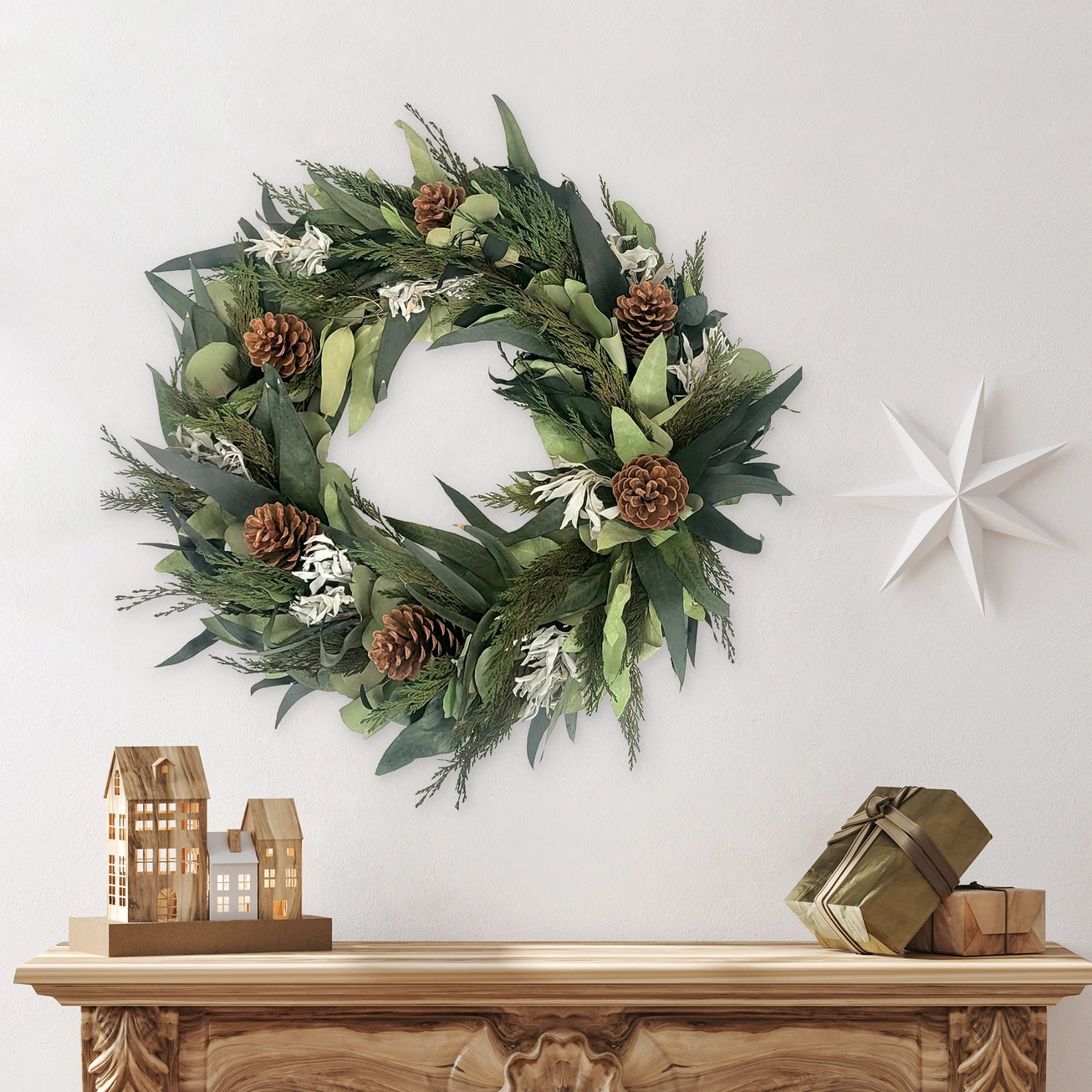A festive wreath that can both transition in and out of the holiday with its lush greenery, this wreath is made on a twig base covered in gorgeous dried sage, willow eucalyptus leaves, and accentuated with pinecones.