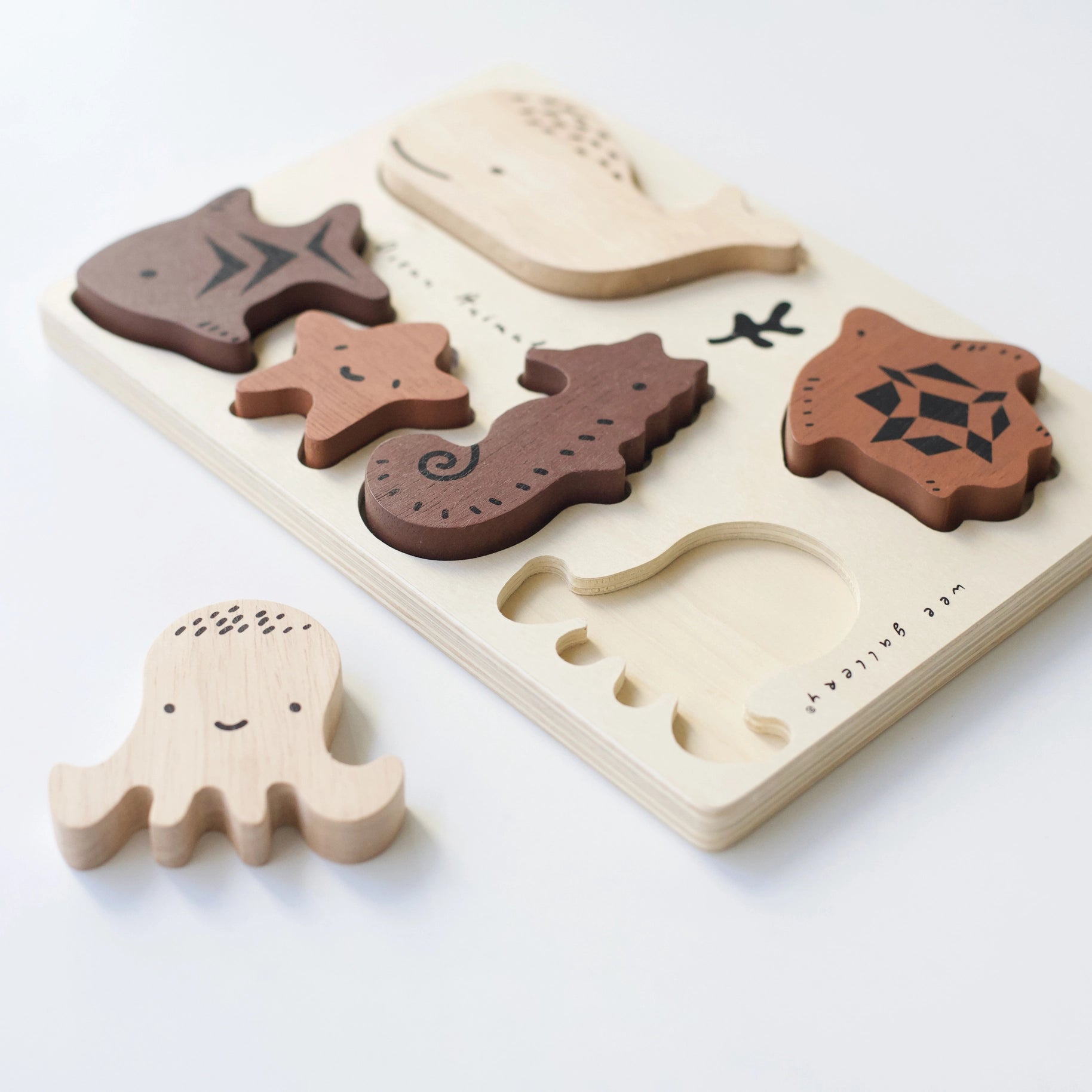 Our six piece Wooden Puzzle is perfect for so many kinds of play! Solving the tray puzzle is just the beginning. You can also use the adorable wooden animals as play time characters in this themed Ocean set. For more educational fun, teach your child to recognize and find each creature in the artwork on the back of each puzzle tray.