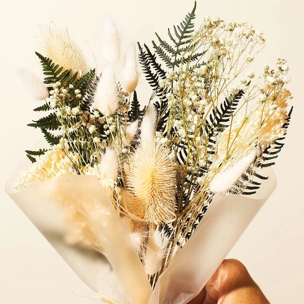 The Woodland Bouquet is a neutral white & green mix of preserved flowers.